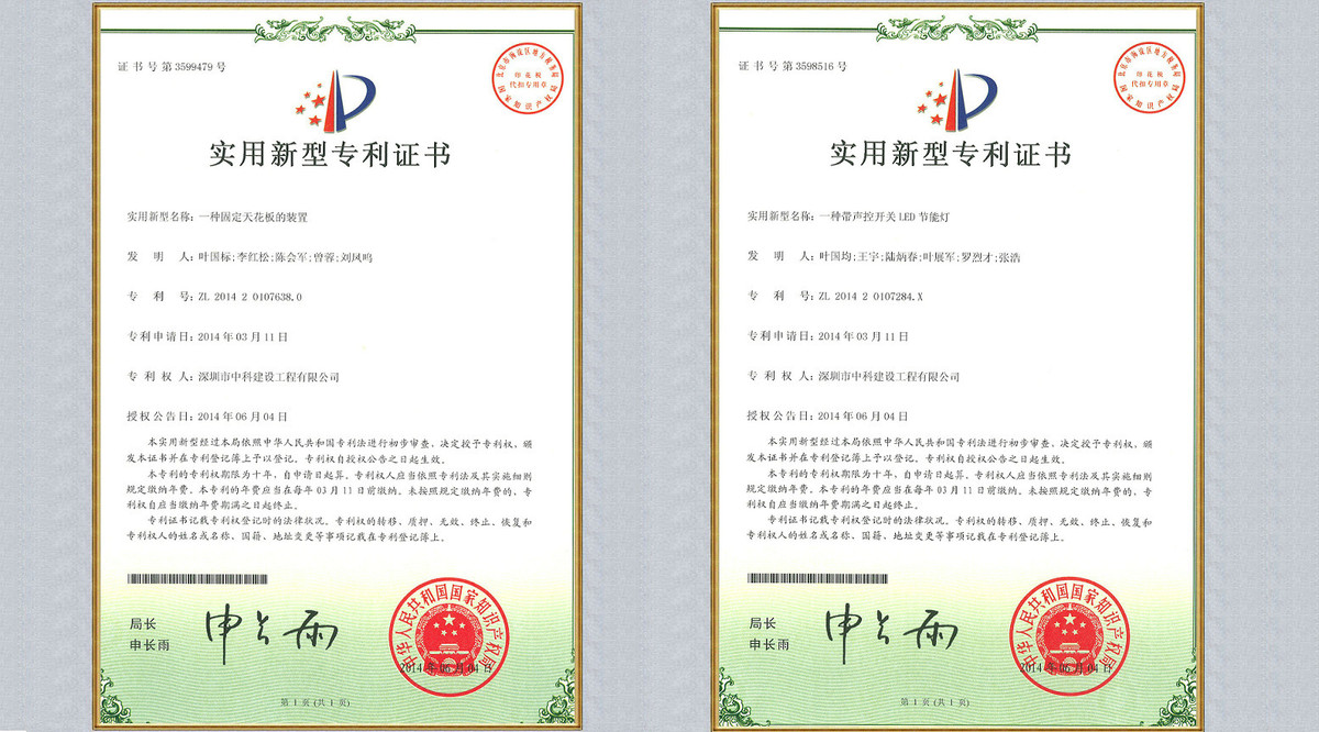 近日,由深圳市中科建設(shè)工程有限公司自主研發(fā)的“帶聲控開關(guān)的LED節(jié)能燈”和“固定天花板裝置”分...