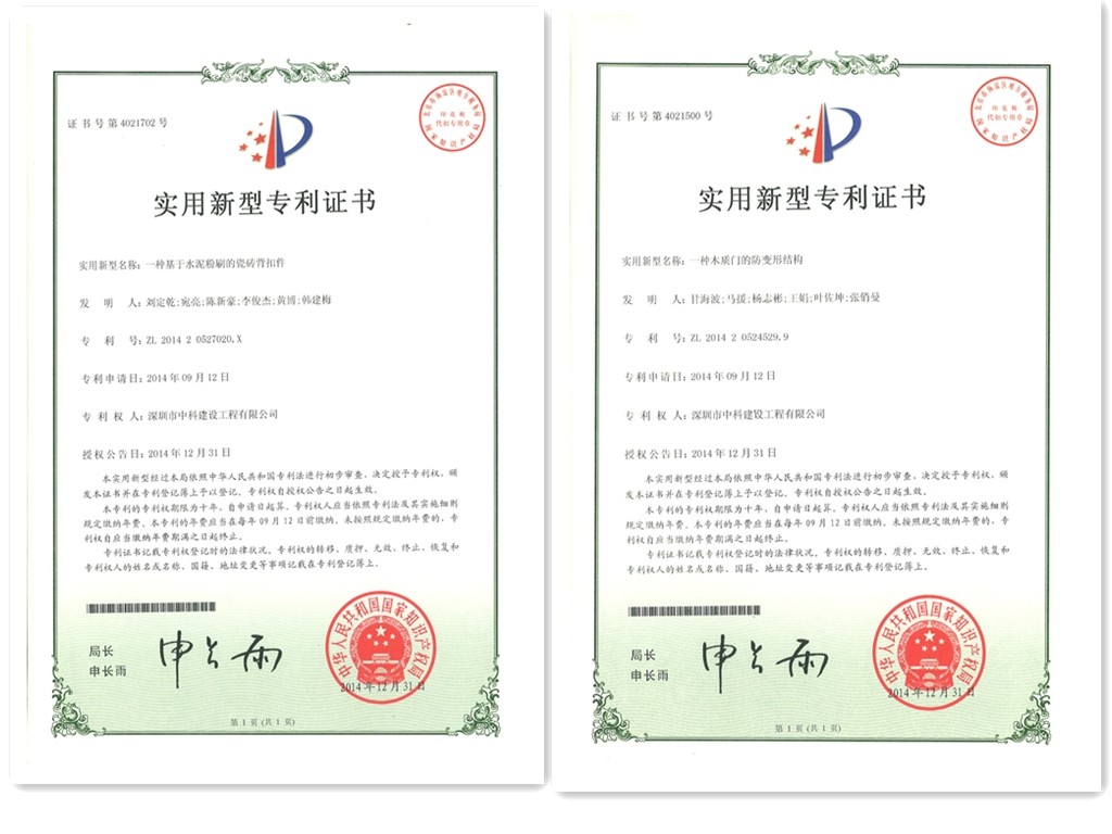 深圳市中科建設(shè)集團(tuán)有限公司自主研發(fā)的“木質(zhì)門的防變形結(jié)構(gòu)”和“基于水泥粉的瓷磚背扣件”分別...